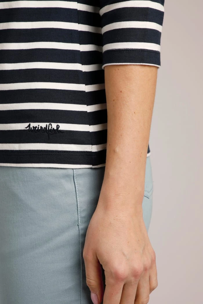 A classic striped top with a twist, this organic cotton number is the perfect addition to your wardrobe. Featuring a wide scoop neckline, 3/4 length sleeves and a eyecatching navy and white stripe pattern, you’ll love rocking the Fleur striped top throughought the seasons.