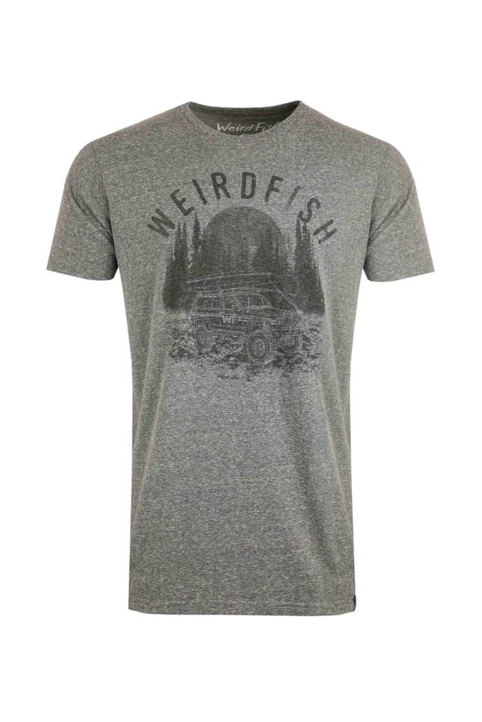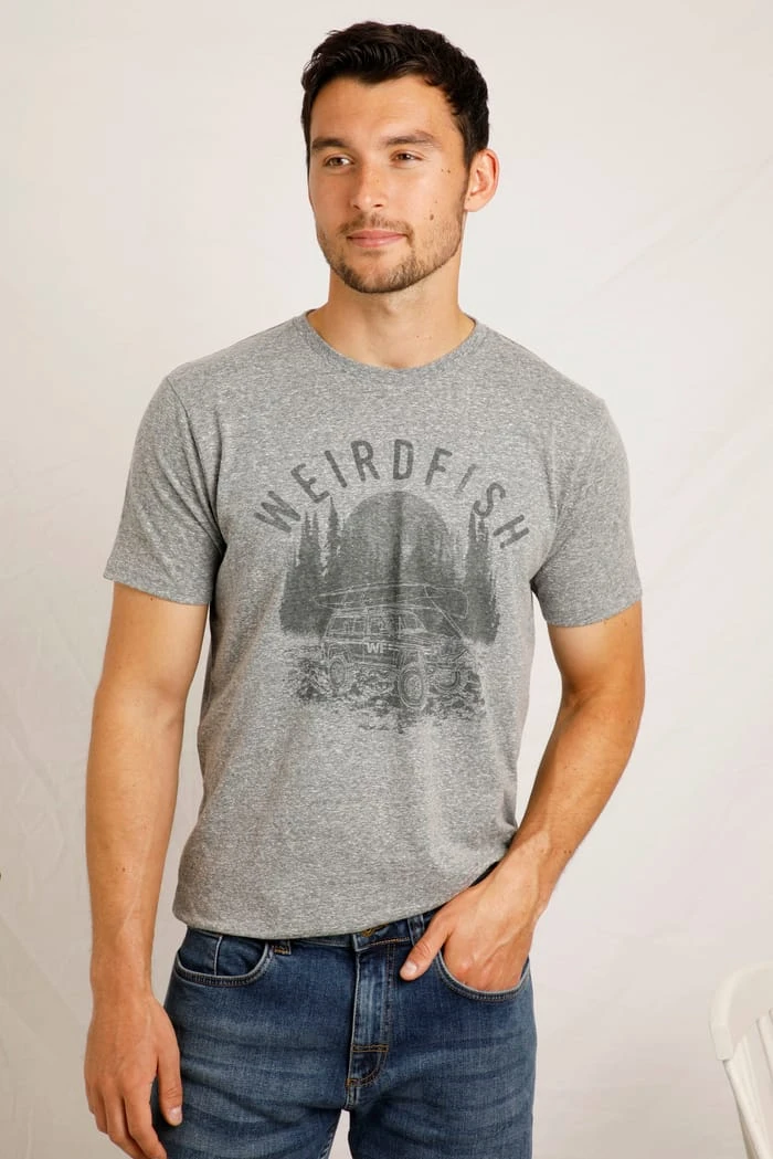 One for the adventurers! Our Off Grid Graphic T-Shirt is made from a unique snow marl fabric and features an exclusive design showcasing an off-road 4×4, canoes and a watercolour inspired forest background.